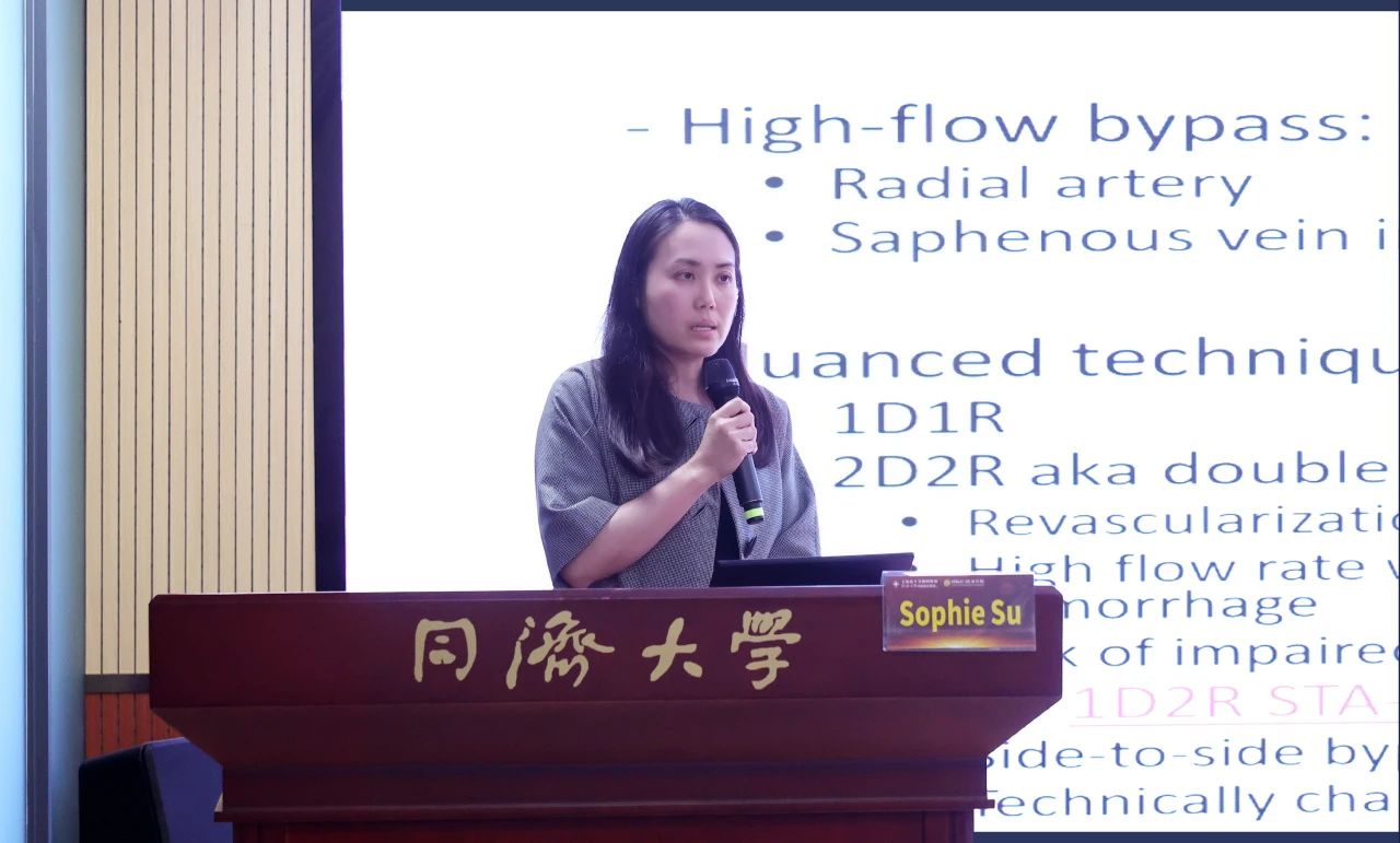 Sophie Su博士作“煙霧病的迷障”學術報告,她詳細介紹了煙霧病概述、治療目標、手術方案選擇依據、療效與隨訪等,并重點介紹了直接搭橋、間接搭橋、聯合搭橋等多種搭橋手術技術的可行性、技術細節、臨床應用及其優缺點等,提升了大家對煙霧病的認識,拓展了臨床診療思路。