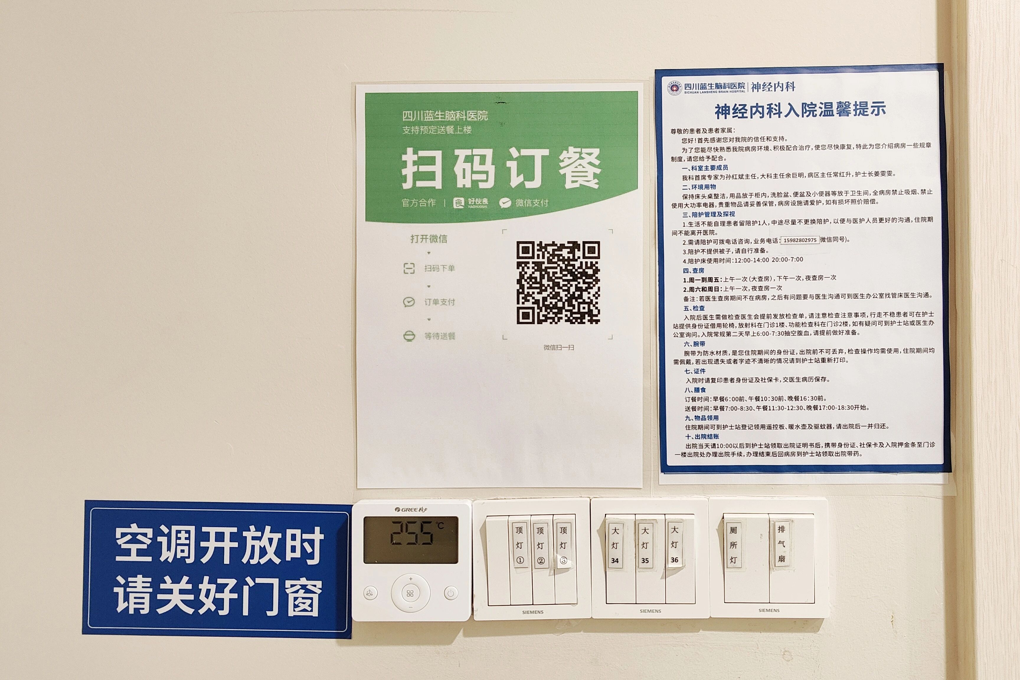 在四川藍生腦科醫院住院部的每間病房,都會看到一張帶有“掃碼訂餐”的二維碼,患者或家屬只需要用手機掃一掃,便可進入食堂訂餐頁面,選擇自己喜歡的飯菜,支付后即可送餐到床頭,如果患者不方便點餐或者不會操作,可以讓護士幫忙,也可以由家人保存二維碼后遠程點餐,方便快捷。