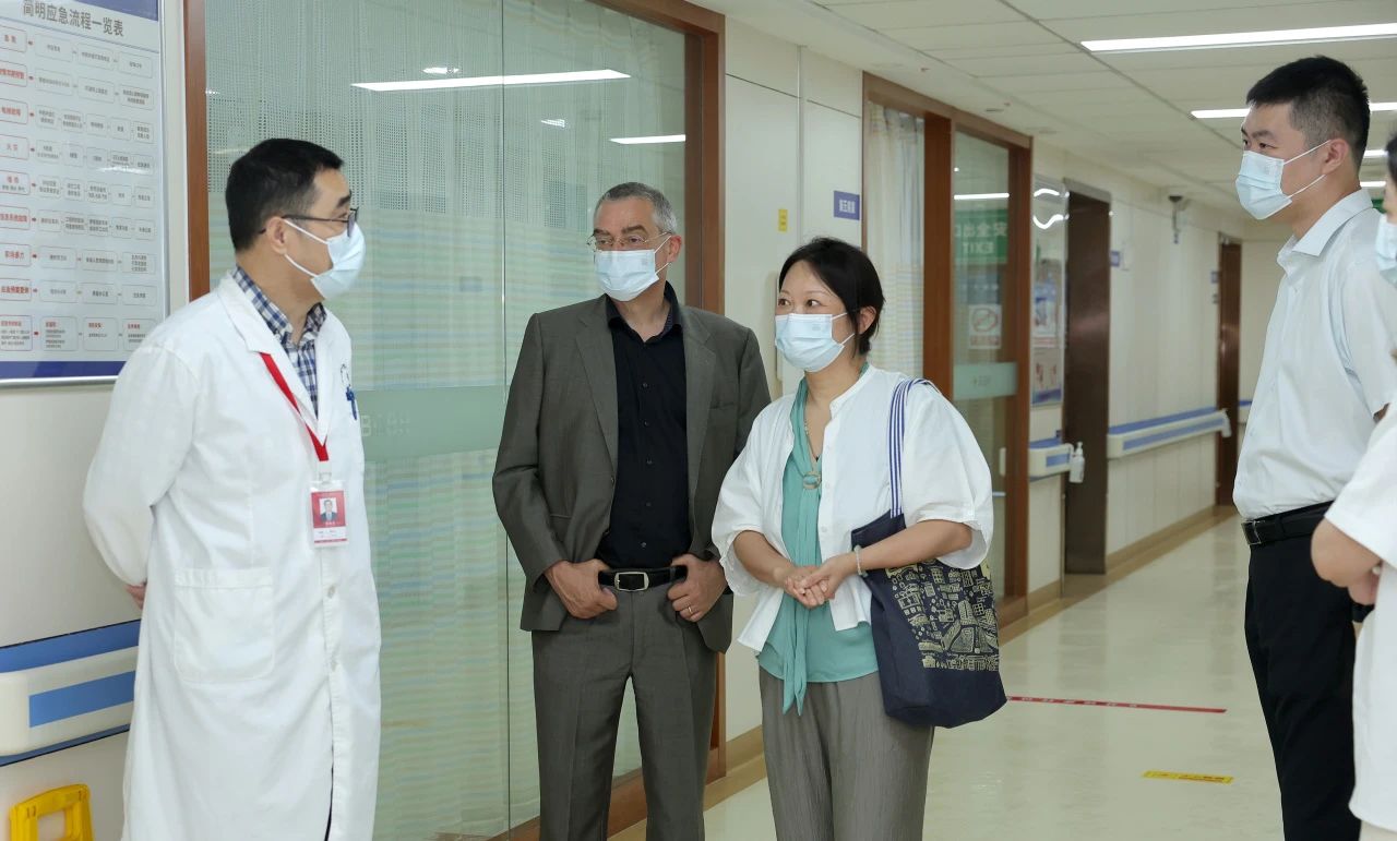 Andreas Heinz教授一行在潘耀良副院長的陪同下,深入醫院手術室、9F重癥醫學科、8A神經內六科、7A神經內三科、6B神經外二科、康復醫學科、放療科、醫學影像科、高壓氧科等科室參觀。