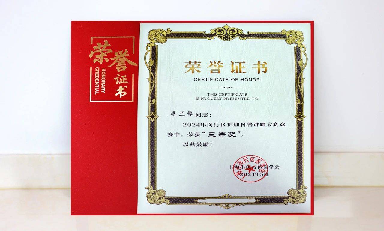 《動起來,不要被“栓”住》凝聚了醫院護理團隊的智慧和努力,以預防“血栓”疾病為主題,以“深靜脈血栓(DVT)”真實事例為切入點,通過視頻和現場講解相結合的方式,展示了血栓的病因、危害、形成和預防常識,多角度地將深奧的專業醫學知識進行生動鮮活的演繹。憑借精妙的創意及李蘭馨護士長現場出色的演講,讓觀眾及評委產生了強烈的代入感和認同感,在53個作品中脫穎而出,獲得“2024 年閔行區護理科普講解大賽”三等獎的佳績。