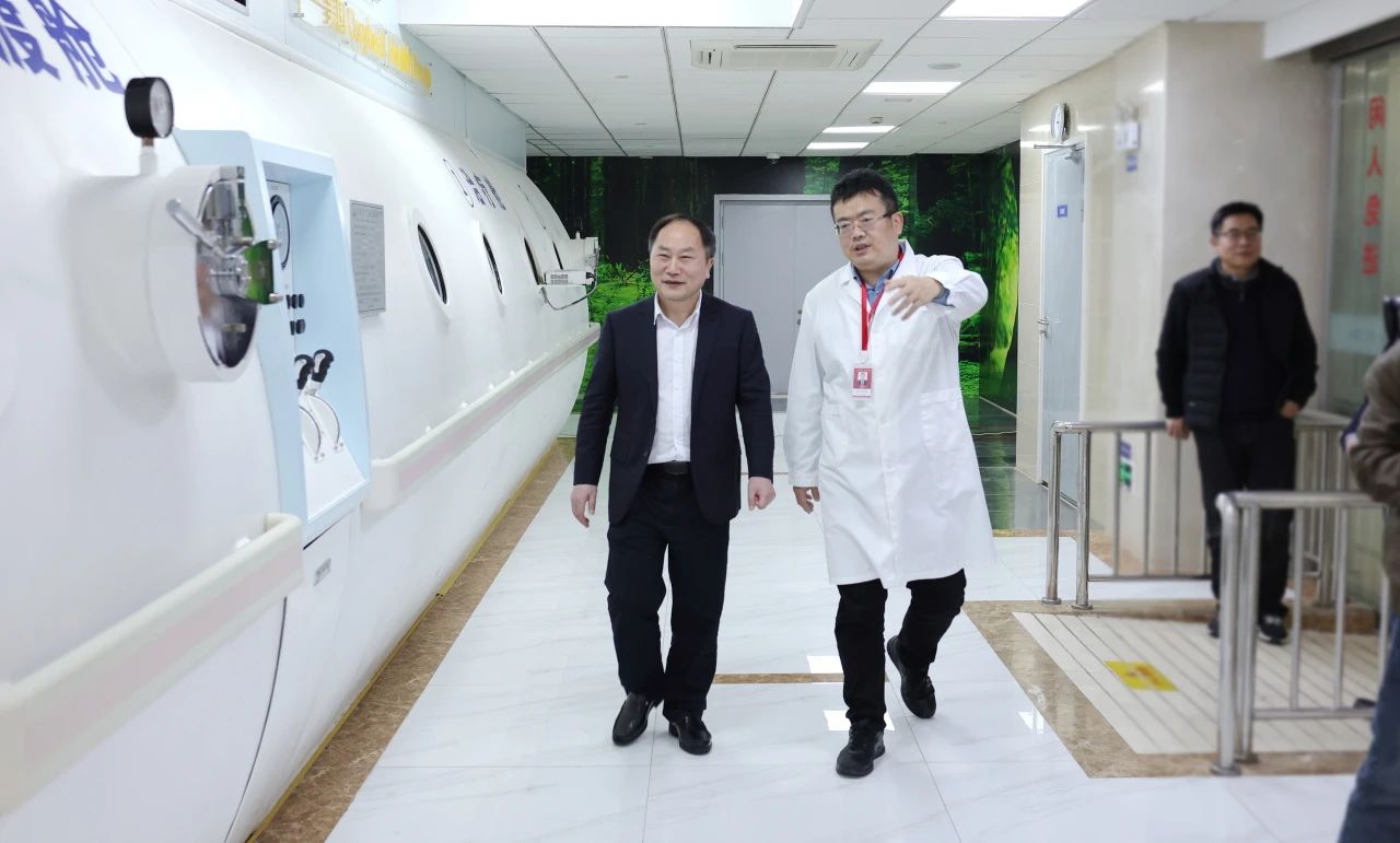 儀式結束后,張曉華教授一行在朱敏書記的帶領下,深入醫院手術室、9F重癥醫學科、康復醫學科、影像醫學科、高壓氧科、放療科等特色科室實地參觀,進一步加深對醫院的了解,并就醫院學科建設、人才培養、科研創新、醫療服務、醫院管理等方面內容進行了互動交流。