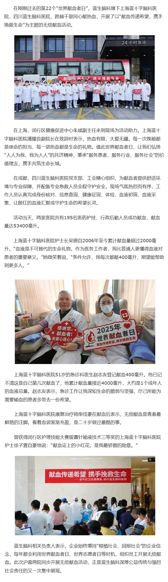 在剛剛過去的第22個“世界獻血者日”,藍生腦科旗下上海藍十字腦科醫院、四川藍生腦科醫院,跨越千里同心獻熱血,開展了以“獻血傳遞希望,攜手挽救生命”為主題的無償獻血活動。