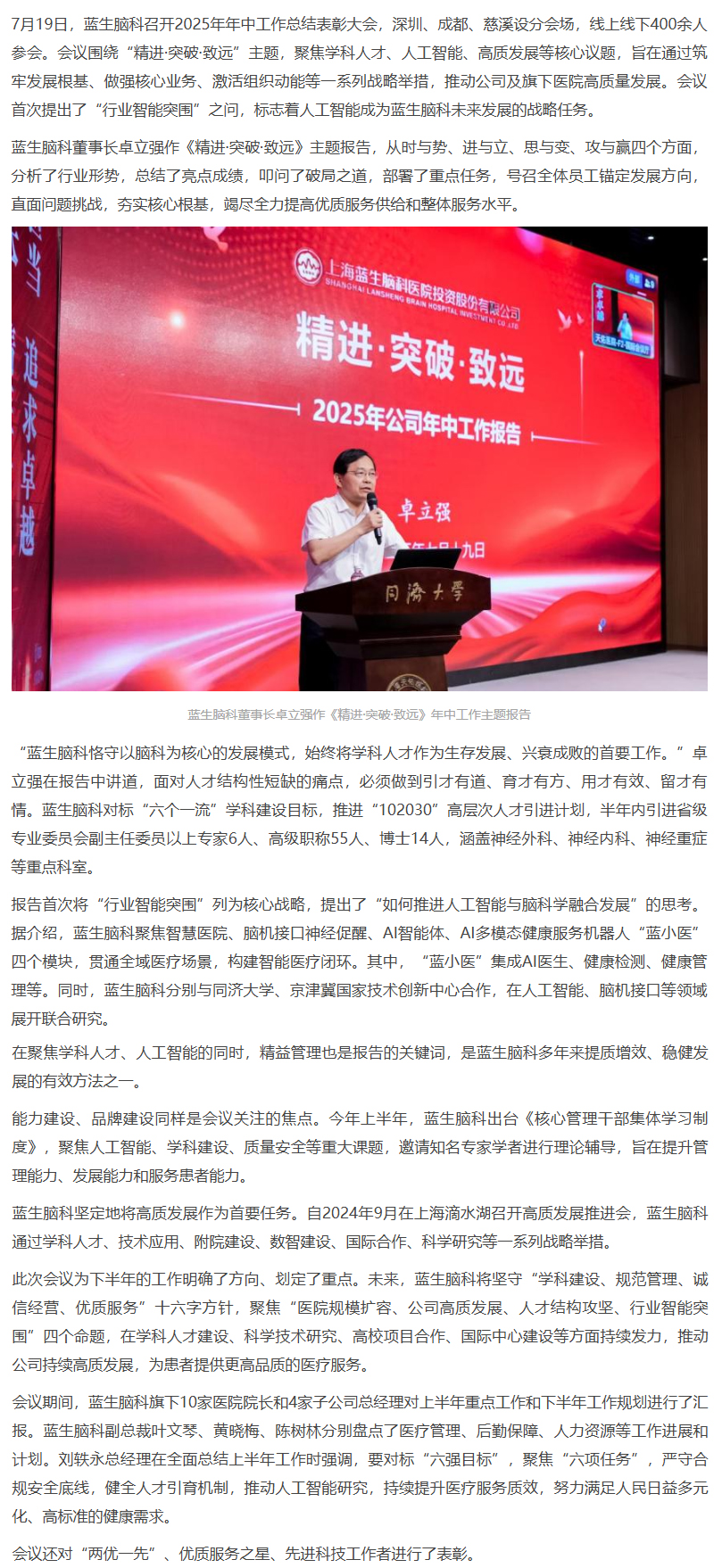 7月19日,藍生腦科召開2025年年中工作總結表彰大會,深圳、成都、慈溪設分會場,線上線下400余人參會。會議圍繞“精進·突破·致遠”主題,聚焦學科人才、人工智能、高質發展等核心議題,旨在通過筑牢發展根基、做強核心業務、激活組織動能等一系列戰略舉措,推動公司及旗下醫院高質量發展。會議首次提出了“行業智能突圍”之問,標志著人工智能成為藍生腦科未來發展的戰略任務。