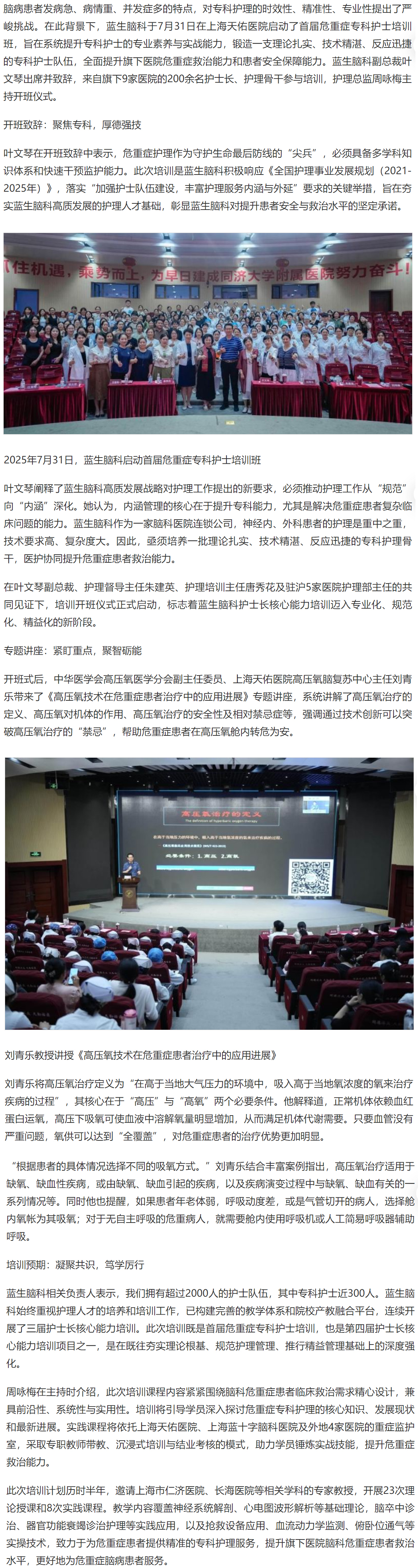 腦病患者發病急、病情重、并發癥多的特點,對專科護理的時效性、精準性、專業性提出了嚴峻挑戰。在此背景下,藍生腦科于7月31日在上海天佑醫院啟動了首屆危重癥??谱o士培訓班,旨在系統提升??谱o士的專業素養與實戰能力,鍛造一支理論扎實、技術精湛、反應迅捷的專科護士隊伍,全面提升旗下醫院危重癥救治能力和患者安全保障能力。藍生腦科副總裁葉文琴出席并致辭,來自旗下9家醫院的200余名護士長、護理骨干參與培訓,護理總監周詠梅主持開班儀式。