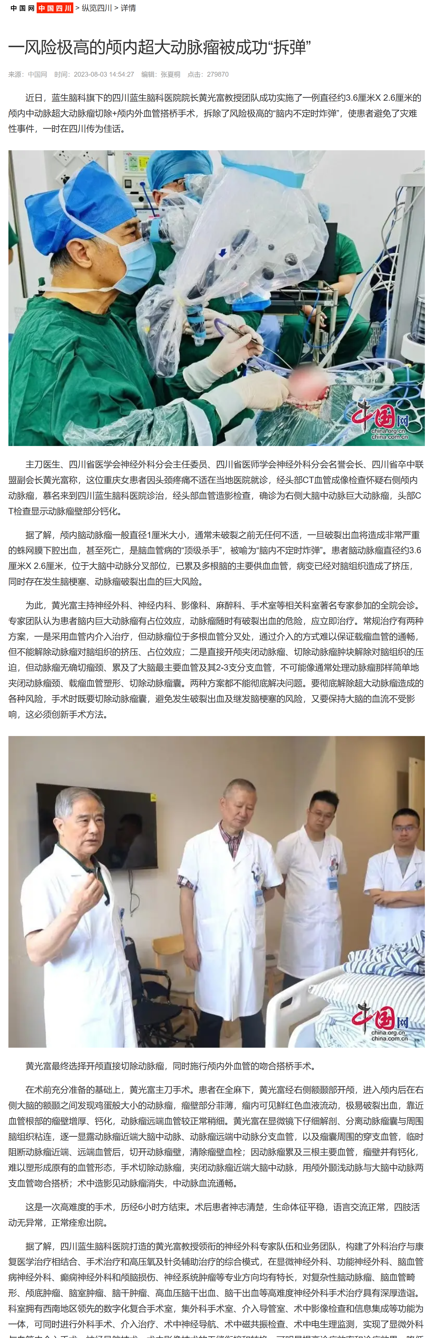 近日,藍生腦科旗下的四川藍生腦科醫院院長黃光富教授團隊成功實施了一例直徑約3.6厘米X 2.6厘米的顱內中動脈超大動脈瘤切除+顱內外血管搭橋手術,拆除了風險極高的“腦內不定時炸彈”,使患者避免了災難性事件,一時在四川傳為佳話。