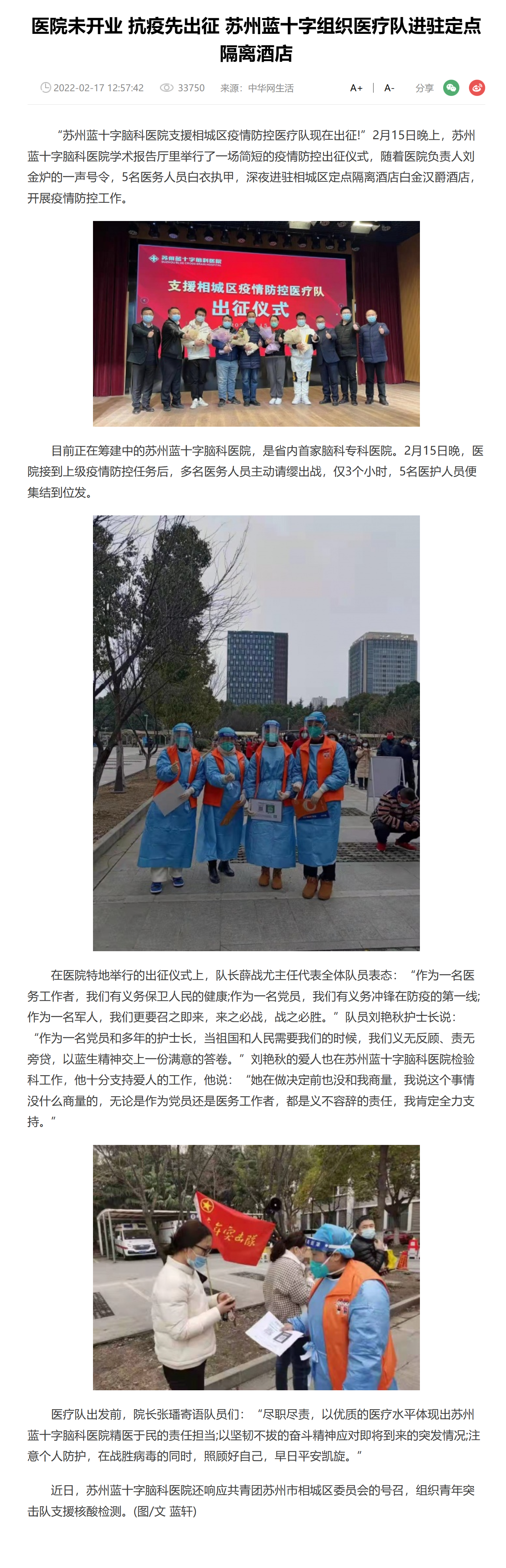 “蘇州藍十字腦科醫院支援相城區疫情防控醫療隊現在出征!”2月15日晚上,蘇州藍十字腦科醫院學術報告廳里舉行了一場簡短的疫情防控出征儀式,隨著醫院負責人劉金爐的一聲號令,5名醫務人員白衣執甲,深夜進駐相城區定點隔離酒店白金漢爵酒店,開展疫情防控工作。