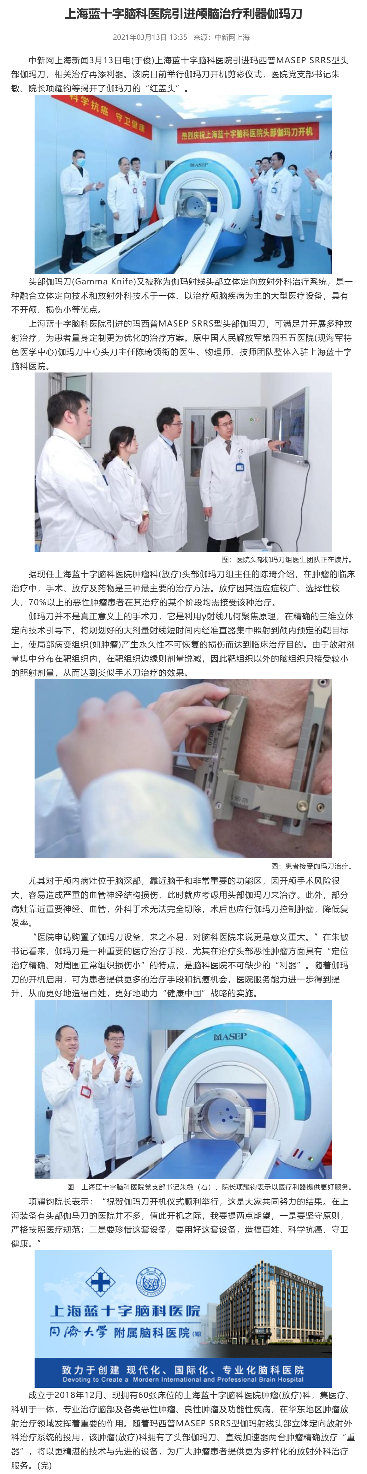 中新網上海新聞3月13日電(于俊)上海藍十字腦科醫院引進瑪西普MASEP SRRS型頭部伽瑪刀,相關治療再添利器。該院日前舉行伽瑪刀開機剪彩儀式,醫院黨支部書記朱敏、院長項耀鈞等揭開了伽瑪刀的“紅蓋頭”。