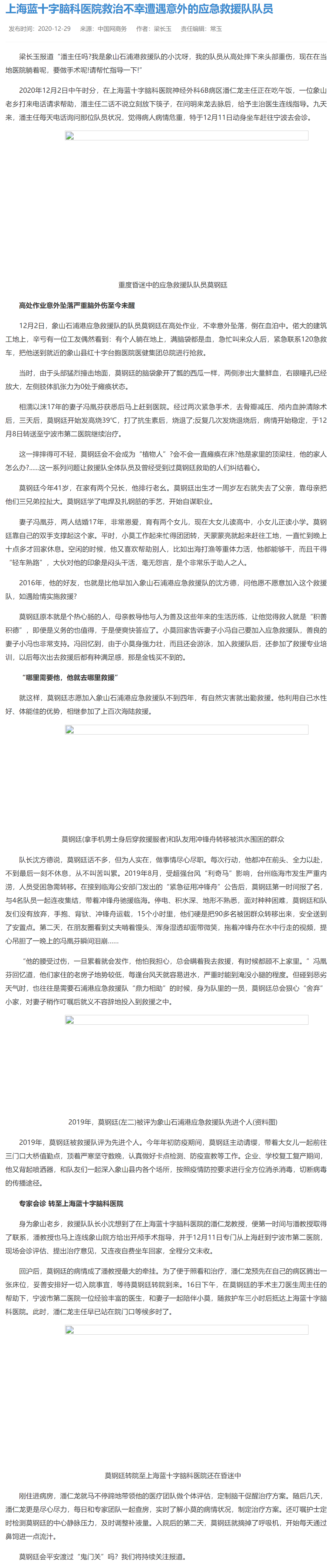 梁長玉報道“潘主任嗎?我是象山石浦港救援隊的小沈呀,我的隊員從高處摔下來頭部重傷,現在在當地醫院躺著呢,要做手術呢!請幫忙指導一下!”