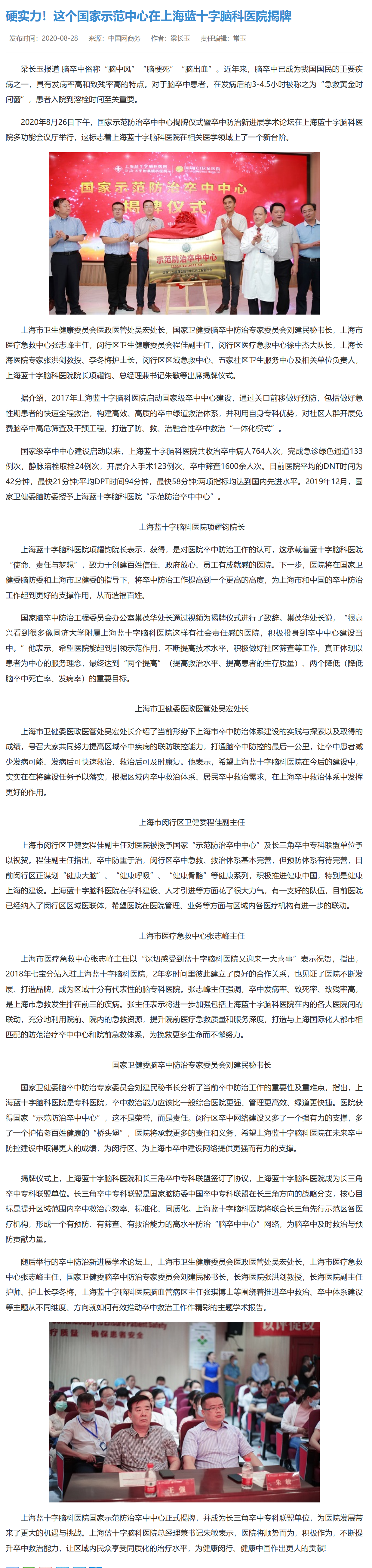 2020年8月26日下午,國家示范防治卒中中心揭牌儀式暨卒中防治新進展學術論壇在上海藍十字腦科醫院多功能會議廳舉行,這標志著上海藍十字腦科醫院在相關醫學領域上了一個新臺階。
