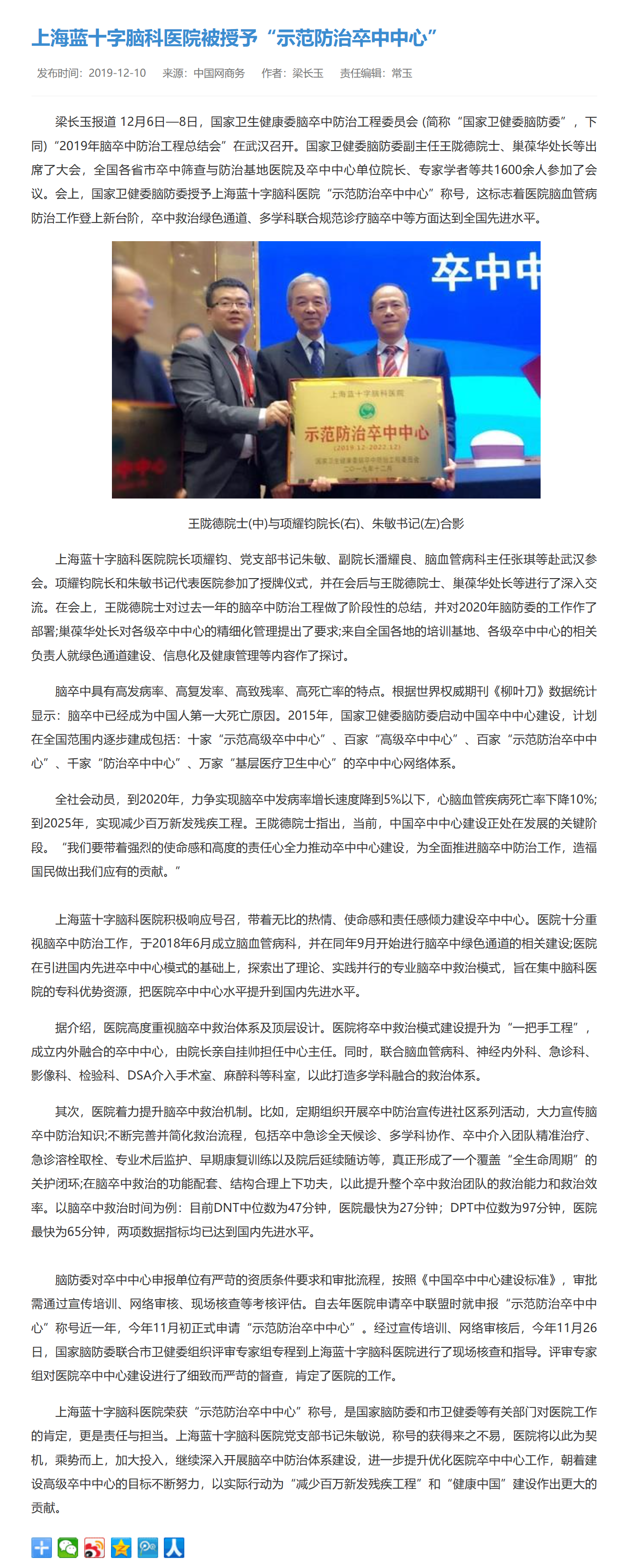 梁長玉報道 12月6日—8日,國家衛生健康委腦卒中防治工程委員會 (簡稱“國家衛健委腦防委”,下同)“2019年腦卒中防治工程總結會”在武漢召開。國家衛健委腦防委副主任王隴德院士、巢葆華處長等出席了大會,全國各省市卒中篩查與防治基地醫院及卒中中心單位院長、專家學者等共1600余人參加了會議。會上,國家衛健委腦防委授予上海藍十字腦科醫院“示范防治卒中中心”稱號,這標志著醫院腦血管病防治工作登上新臺階,卒中救治綠色通道、多學科聯合規范診療腦卒中等方面達到全國先進水平。