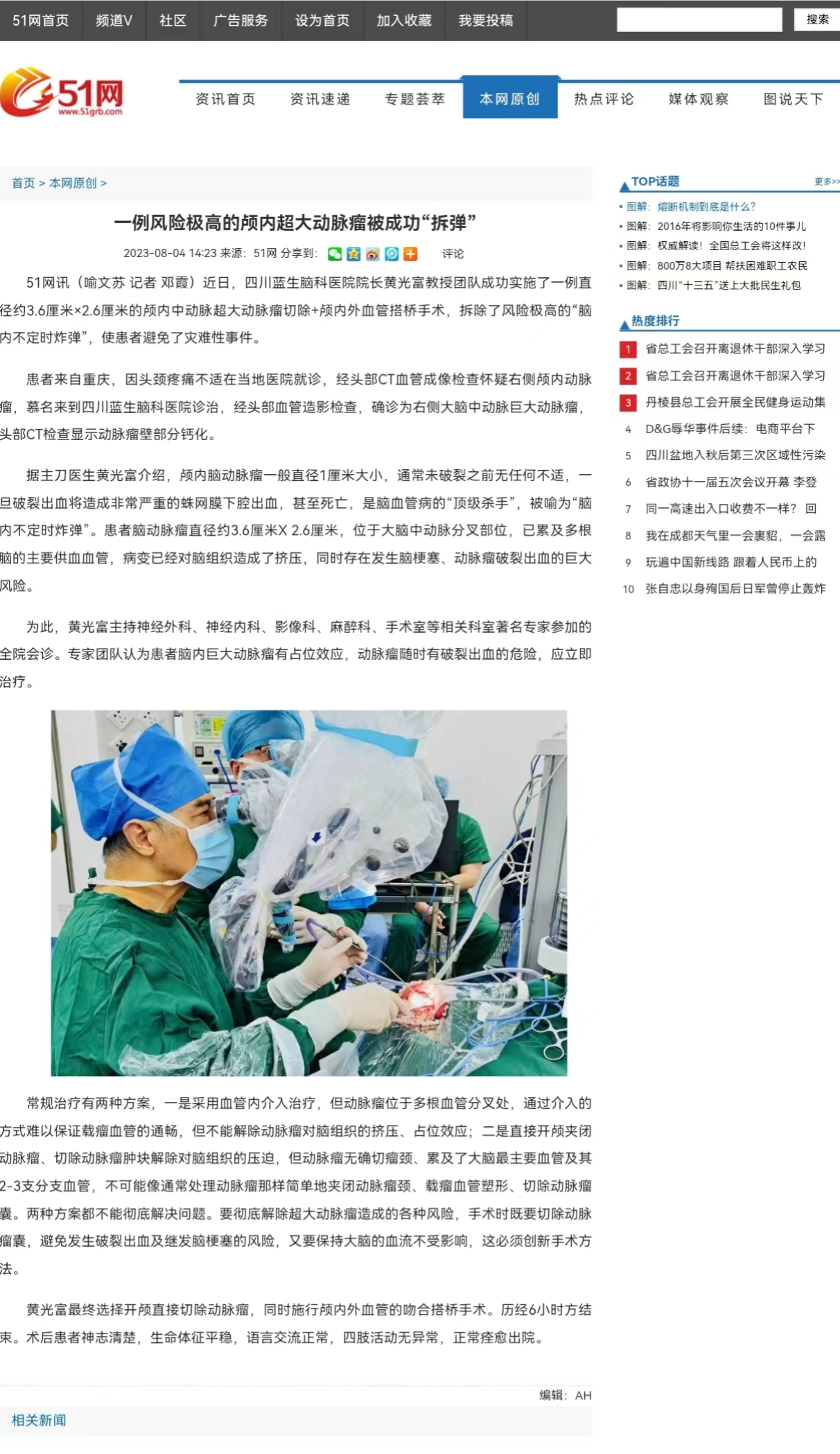 51網訊(喻文蘇 記者 鄧霞)近日,四川藍生腦科醫院院長黃光富教授團隊成功實施了一例直徑約3.6厘米×2.6厘米的顱內中動脈超大動脈瘤切除+顱內外血管搭橋手術,拆除了風險極高的“腦內不定時炸彈”,使患者避免了災難性事件。