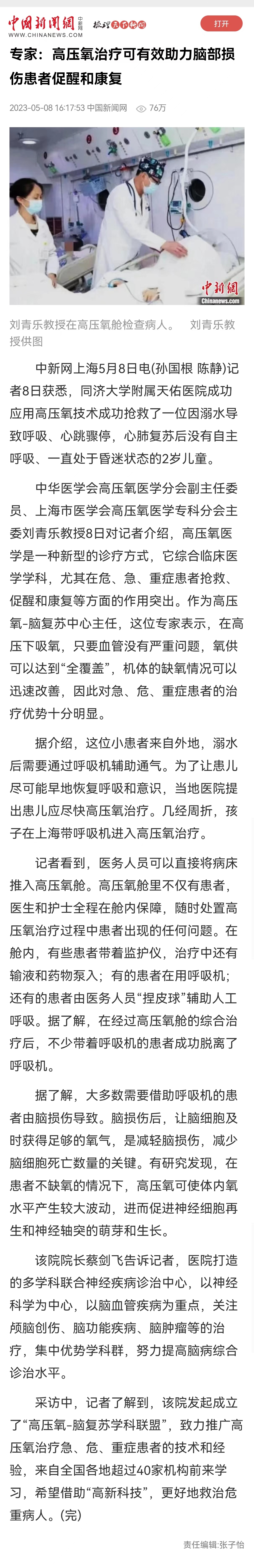 中國新聞網:專家:高壓氧治療可有效助力腦部損傷患者促醒和康復