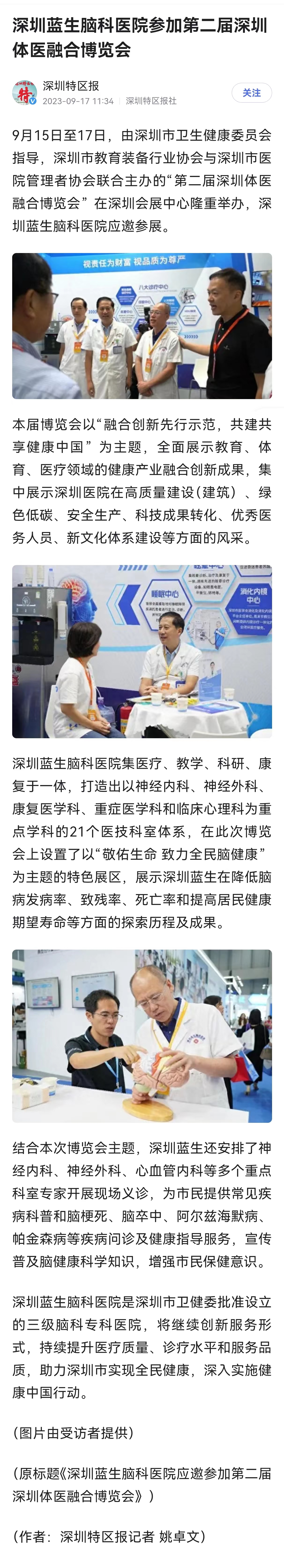 深圳特區報:深圳藍生腦科醫院參加第二屆深圳體醫融合博覽會