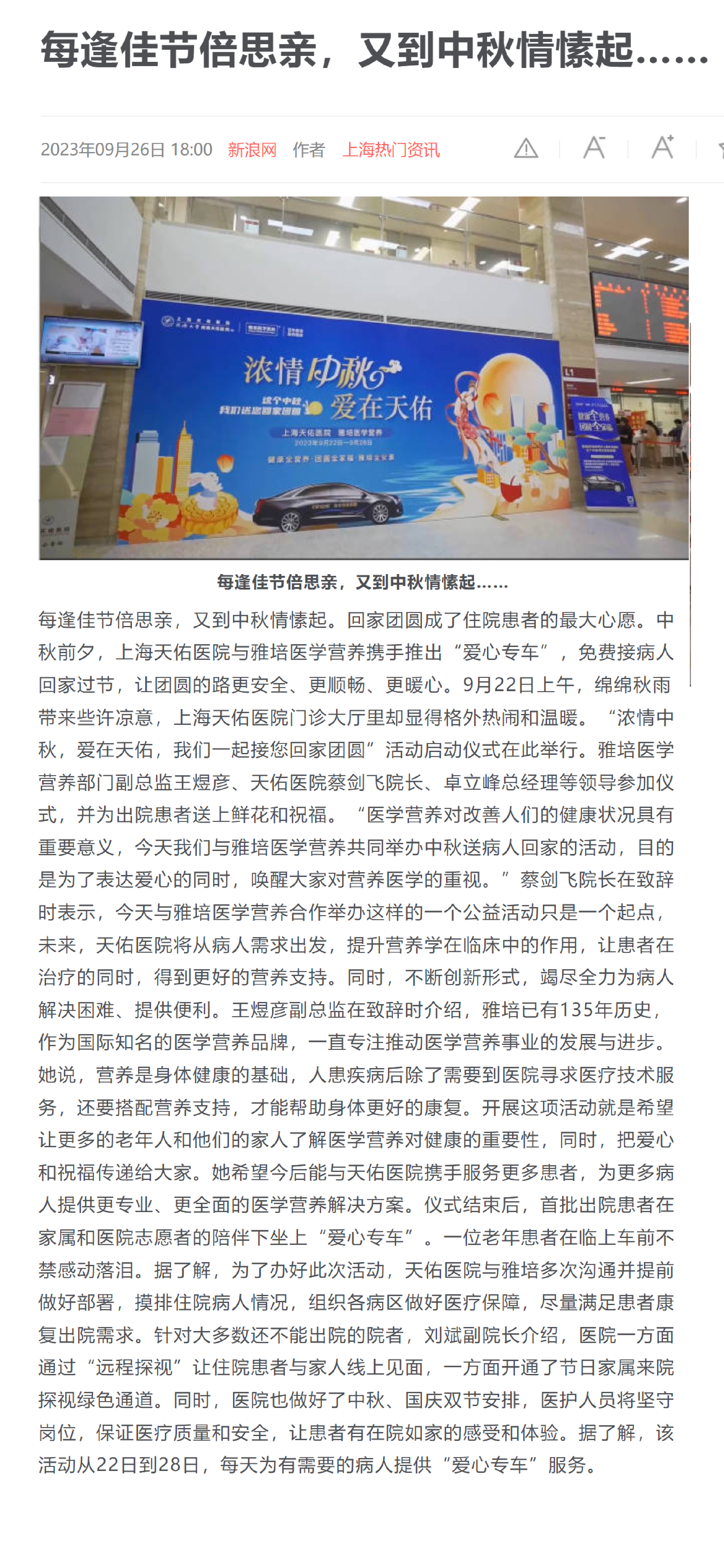 每逢佳節倍思親,又到中秋情愫起?;丶覉F圓成了住院患者的最大心愿。中秋前夕,上海天佑醫院與雅培醫學營養攜手推出“愛心專車”,免費接病人回家過節,讓團圓的路更安全、更順暢、更暖心。9月22日上午,綿綿秋雨帶來些許涼意,上海天佑醫院門診大廳里卻顯得格外熱鬧和溫暖。“濃情中秋,愛在天佑,我們一起接您回家團圓”活動啟動儀式在此舉行。