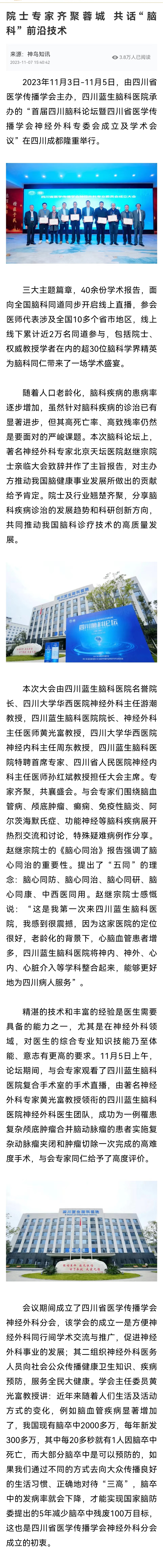 2023年11月3日-11月5日,由四川省醫學傳播學會主辦,四川藍生腦科醫院承辦的“首屆四川腦科論壇暨四川省醫學傳播學會神經外科專委會成立及學術會議”在四川成都隆重舉行。