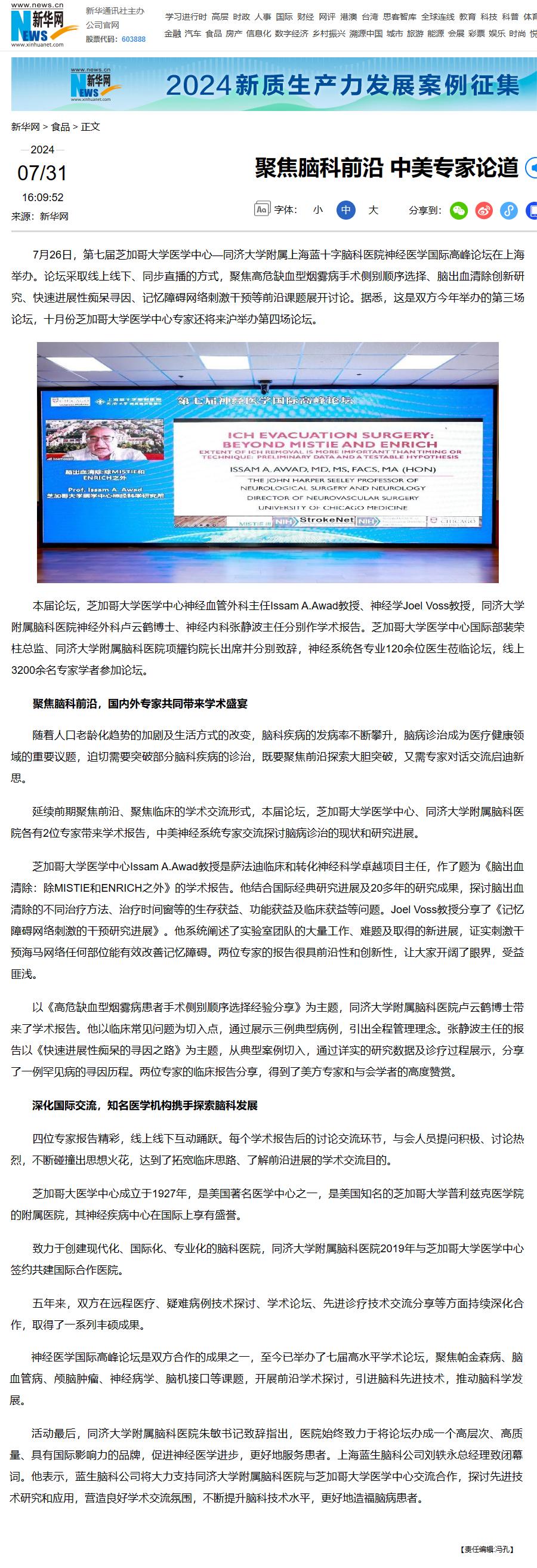 7月26日,第七屆芝加哥大學醫學中心—同濟大學附屬上海藍十字腦科醫院神經醫學國際高峰論壇在上海舉辦。論壇采取線上線下、同步直播的方式,聚焦高危缺血型煙霧病手術側別順序選擇、腦出血清除創新研究、快速進展性癡呆尋因、記憶障礙網絡刺激干預等前沿課題展開討論。