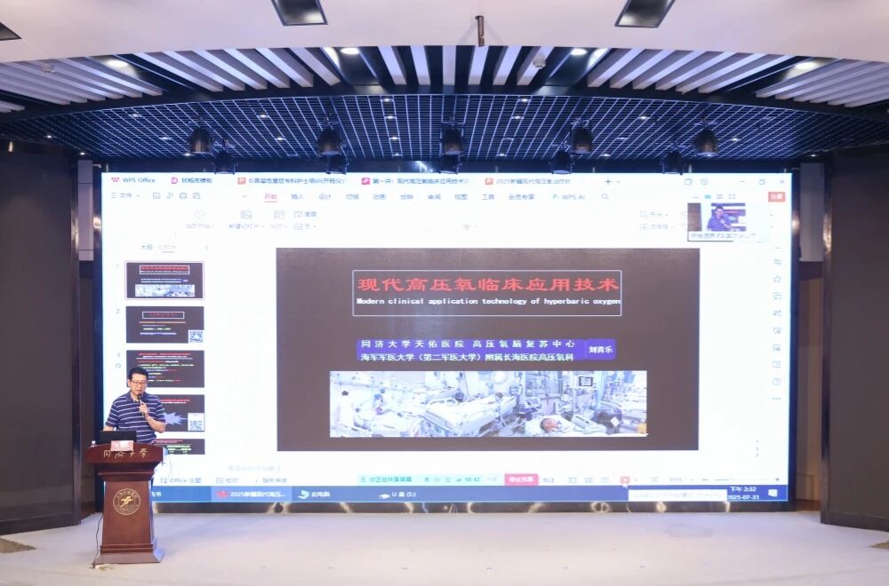 7月31日,上海天佑醫院高壓氧腦復蘇主任劉青樂教授作《現代高壓氧臨床應用技術》專題講座。他從高壓氧定義、高壓氧治療對機體的作用、高壓氧臨床應用等多個方面進行介紹。