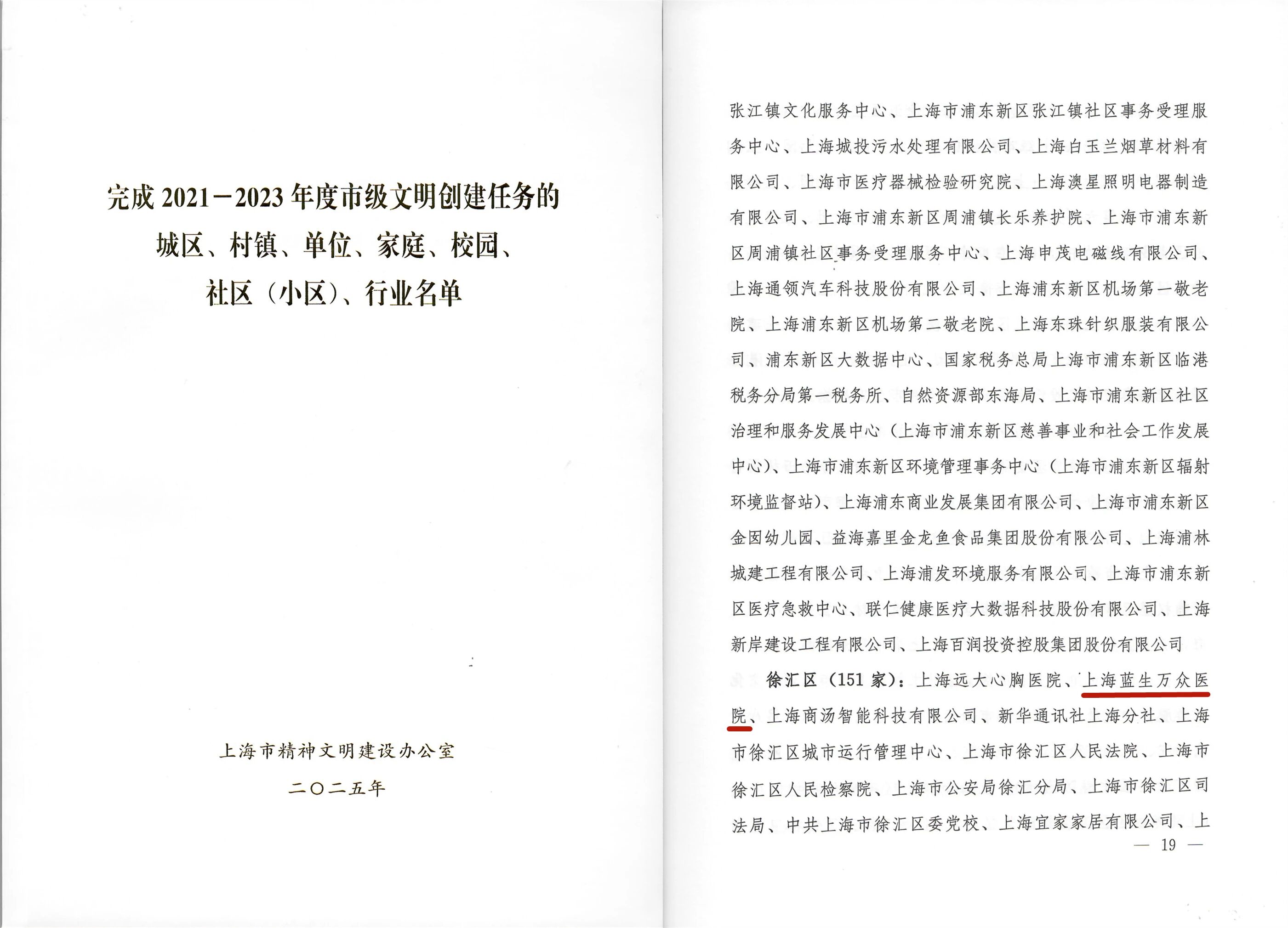 近日,上海市精神文明建設辦公室公布《完成2021-2023年度市級文明創建任務的城區、村鎮、單位、家庭、校園、社區(小區)、行業名單》,上海藍生萬眾醫院憑借扎實的精神文明建設成果,連續第三次榮膺“上海市文明單位”稱號。這一榮譽既是對醫院精神文明建設成果的充分肯定,更是全體員工德信為本、精醫于民、砥礪奮進的生動詮釋。