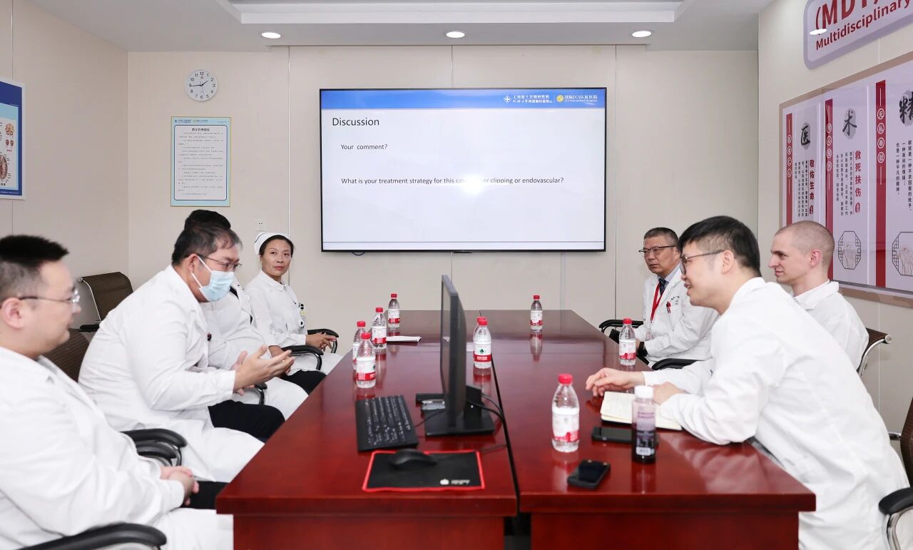在周克祥副院長陪同下,David Satzer博士與6B神經外二科盧云鶴博士團隊開展病例討論。盧云鶴博士以流利英文主持,雙方就大腦中動脈分叉部動脈瘤的治療策略進行交流。David Satzer博士介紹了美國基于指南的外科手術主流方式,并對上海藍十字腦科醫院開展的血流導向裝置、WEB擾流裝置等介入技術表示肯定。此外,雙方還就腦轉移瘤綜合治療、強迫癥外科手術的倫理法律差異等議題展開探討。盧云鶴博士重點介紹了醫院在腦機接口領域的臨床應用,特別是對昏迷患者進行意識評估及脊髓電刺激促醒的實踐成果,引起David Satzer博士濃厚興趣。雙方討論持續兩個半小時,意猶未盡,并互換聯系方式,期待在學科建設與科研合作方面持續推進。