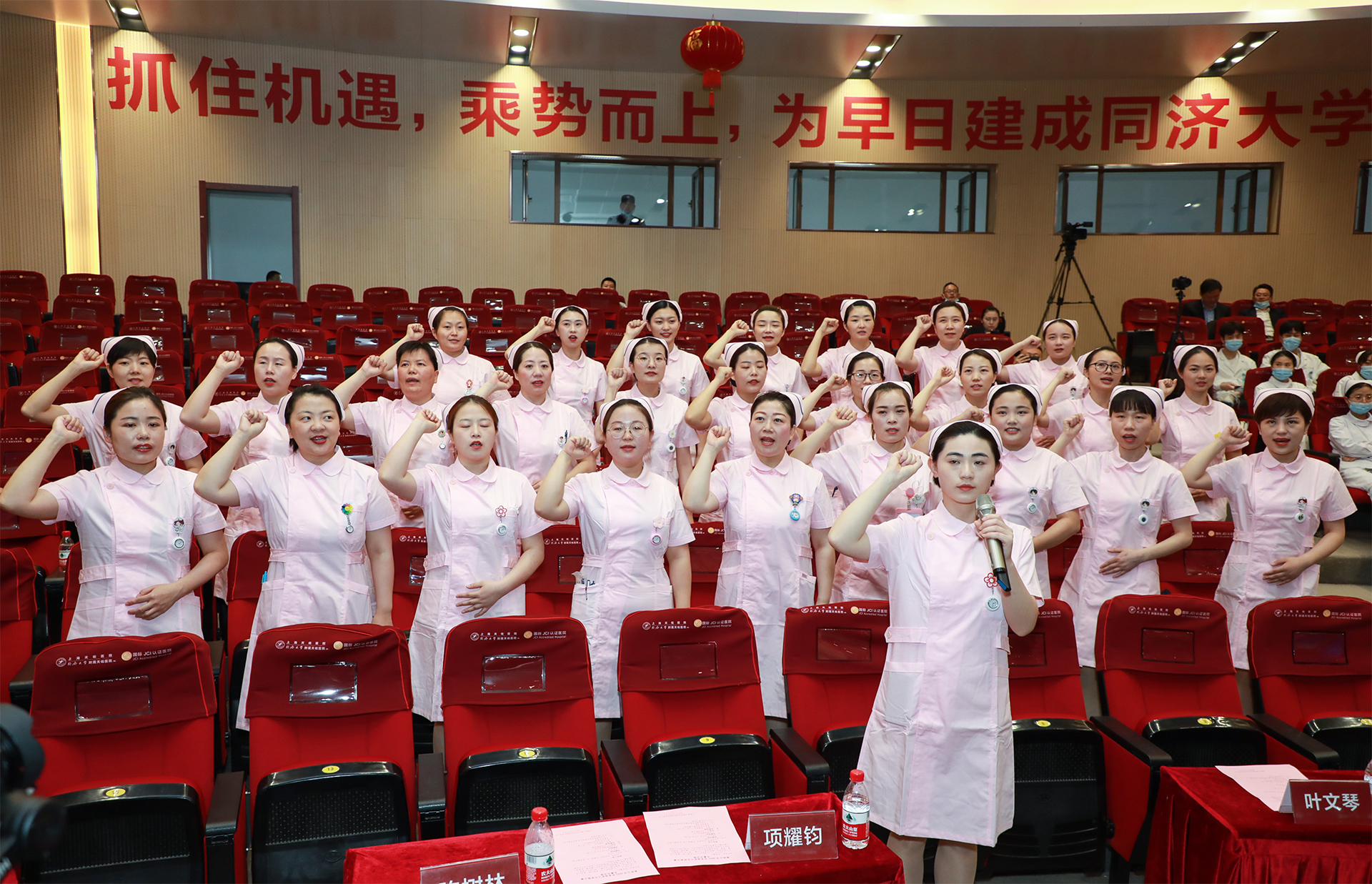 27名參賽選手集體誦讀比賽誓詞,上海藍生萬眾醫院六病區護士長時辰領誓。全體參賽選手精神飽滿,聲音鏗鏘,展現了良好的精神風貌和必勝的決心意志。