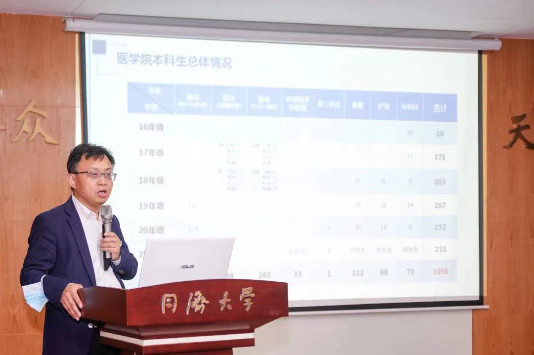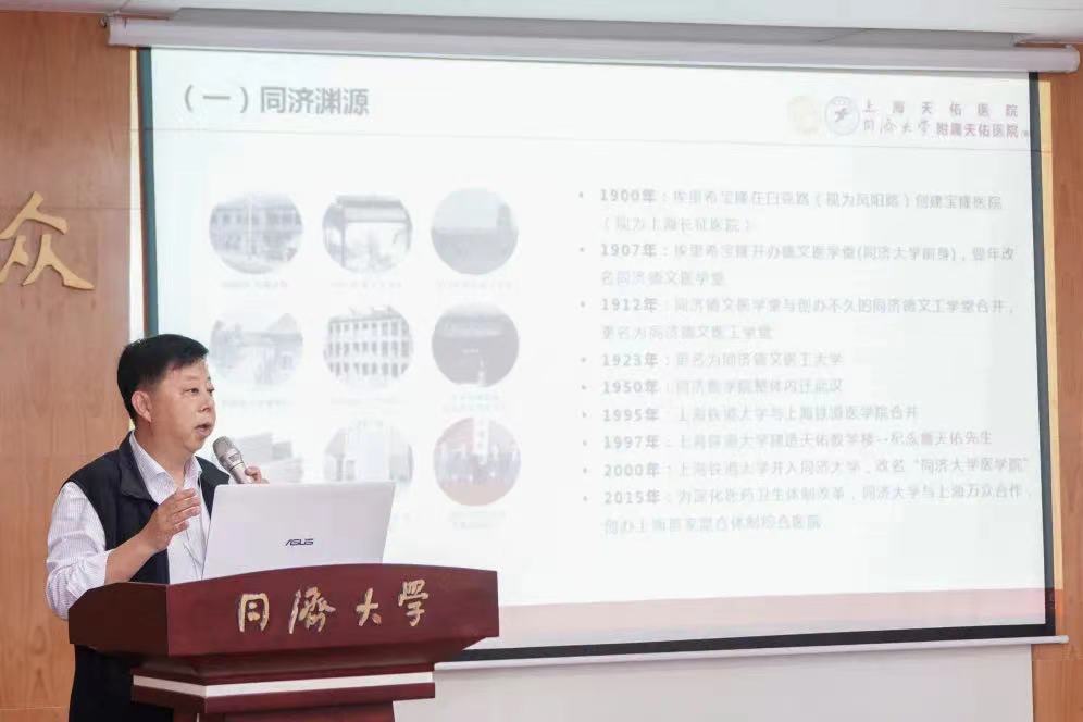 蔡劍飛院長首先從醫院歷史、改革成效、持續探索三個方面,回顧了天佑與同濟的歷史淵源,展示了醫院在探索醫教研協同發展、核心特色打造、人才引進培養以及創建成為同濟大學附屬醫院過程中所作的努力和取得的成效。他表示,醫院是同濟大學攜手上海藍生腦科醫院投資股份有限公司按照三級醫院標準創辦的混合制綜合性醫院。從2018年啟動改革以來,醫院進入快速發展階段。“155”學科建設計劃扎實推進,學科人才建設取得突破,合作共建取得進展,優質服務和滿意工程持續深化,黨建文化和社會公益大放異彩,醫院業務快速發展并有后勁。他強調,醫院身在同濟(滬西校區),心在同濟。醫院能夠取得長足發展,離不開同濟大學各級領導的關懷與支持。未來,醫院將緊跟同濟大學醫學院發展步伐,以同濟醫科“十四五”發展規劃為指引,帶領全院上下團結同心,共同推動醫院臨床醫療、教學、科研、學科和人才隊伍建設等各項工作再上新臺階,為同濟醫教研發展作出應有的貢獻。