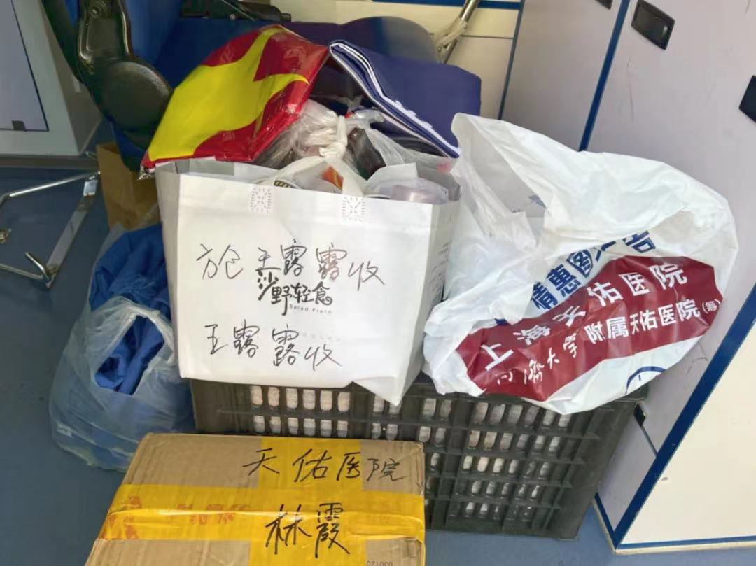 4月9日上午10點左右,天佑醫院安排的專車順利到達普陀區臨時集中隔離點,為在那里參與救治工作的14名隊員送去了水果和生活物資。