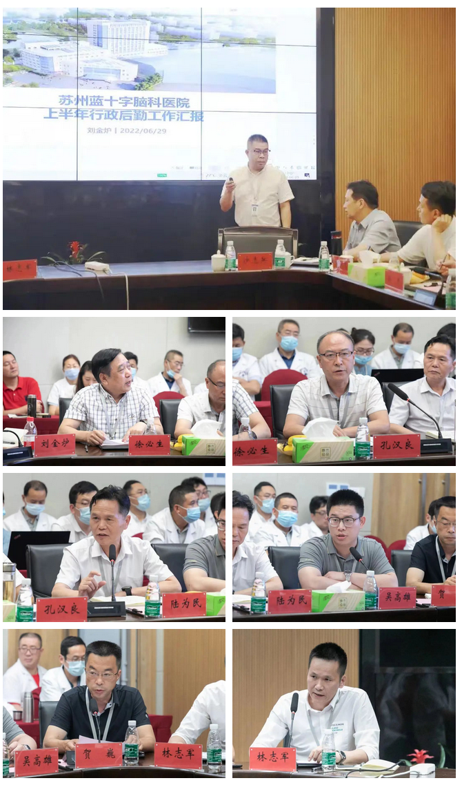 蘇州藍十字腦科醫院張璠院長、劉金爐總經理分別圍繞抗疫工作、執業許可、學科構建、業務工作、醫保工作、黨建工作和行政管理、人事招聘、財務管控、物資采購、信息建設、后勤保障、工程驗收、開業準備作工作匯報。副院長徐必生、孔漢良,副總經理陸為民、吳高雄、賀巍和總經理助理林志軍分別圍繞分管工作作匯報。