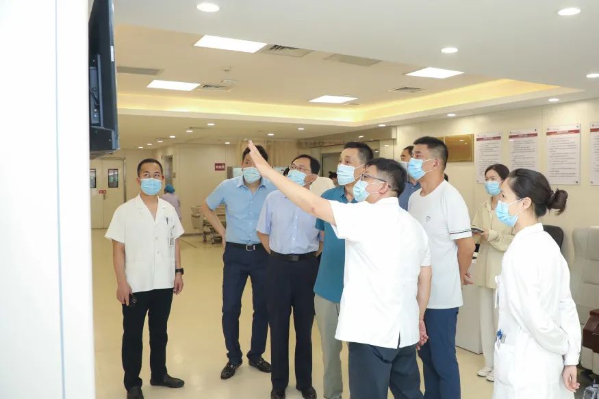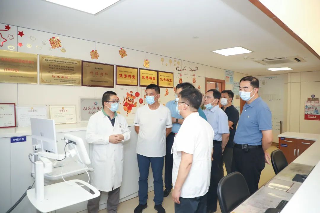 劉永好董事長一行還參觀了康復大廳。陶泉主任引導大家參觀了大廳功能布局和設備設施,介紹了科室日常管理、服務功能、項目開展等情況。劉永好董事長一行還參觀了神經重癥監護室、口腔科及核酸采樣亭。