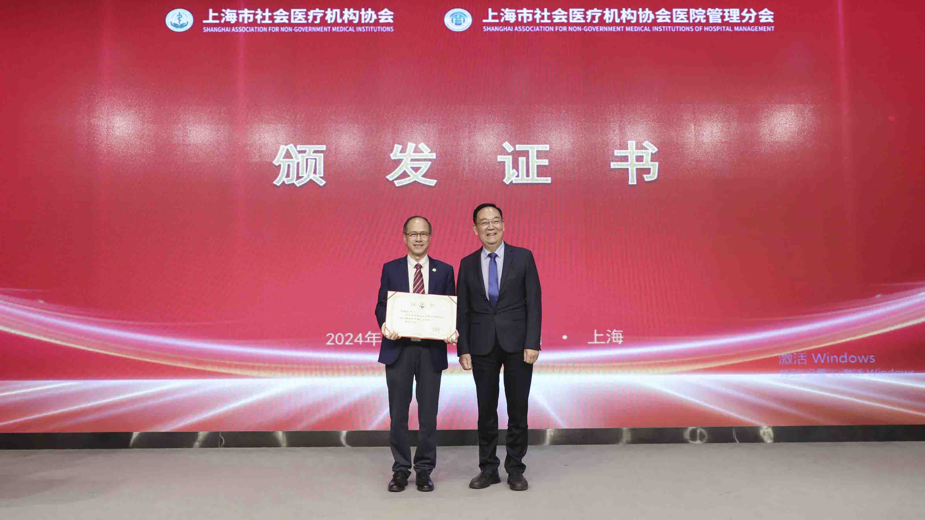 大會向首批入選的高質量發展基地單位授牌,上海天佑醫院王強執行院長、上海藍十字腦科醫院潘耀良副院長上臺領受銅牌。