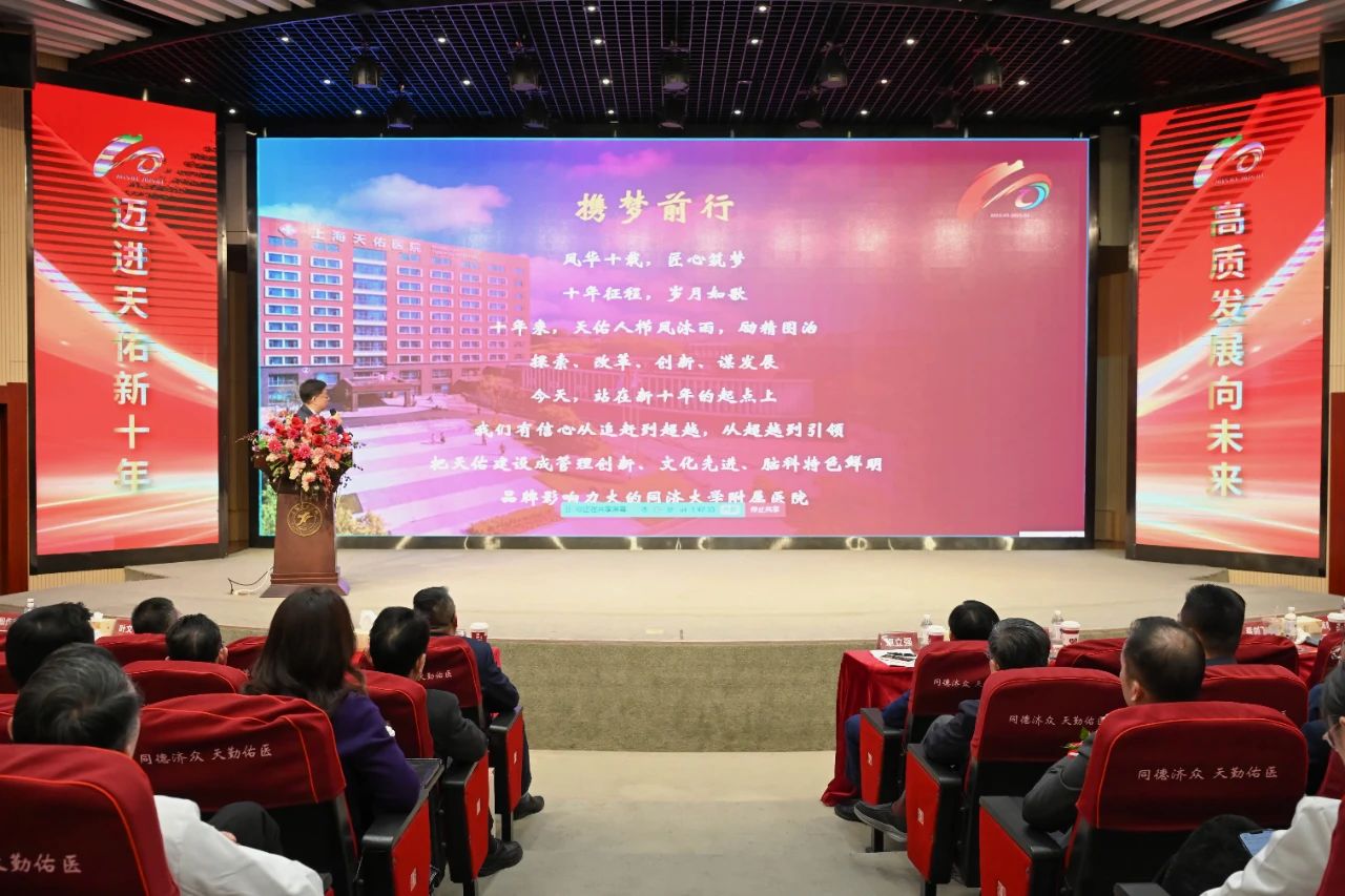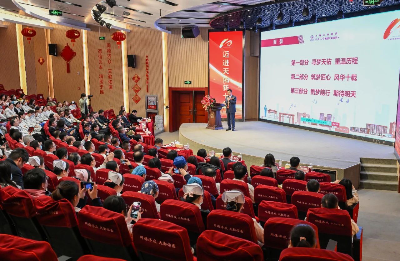 蔡劍飛院長以《守初心 強內涵 擔使命 創品牌 -- 攜夢再出發》為題,回顧了天佑醫院創業史和發展背景,介紹天佑醫院十年創業,改革創新,突破發展的不凡歷程,為天佑醫院新十年描繪了新藍圖。