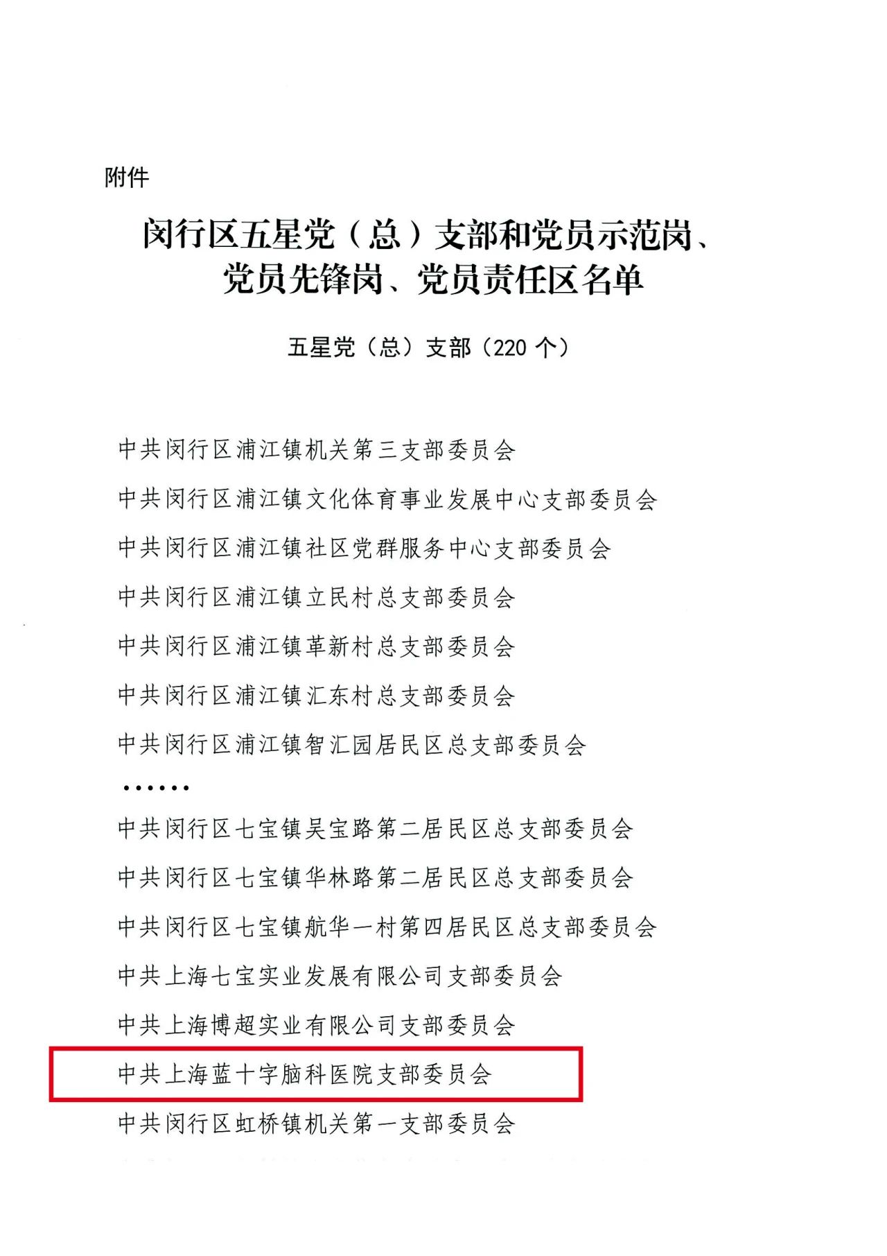 6月23日,為進一步發揮先進典型的示范引領作用,更好激勵各級黨組織和廣大黨員奮進新征程、建功新時代,經中共上海市閔行區委組織部研究決定:命名中共閔行區江川路街道安寧路第一居民區總支部委員會等220個黨(總)支部為“五星黨(總)支部”。中共上海藍十字腦科醫院支部委員會榜上有名。