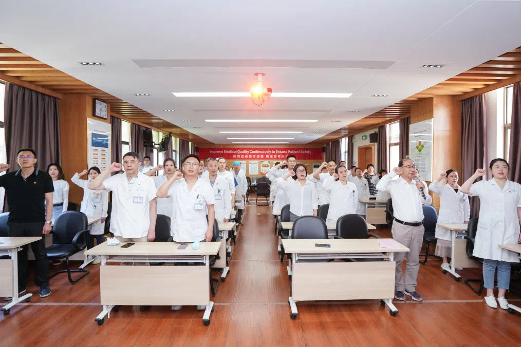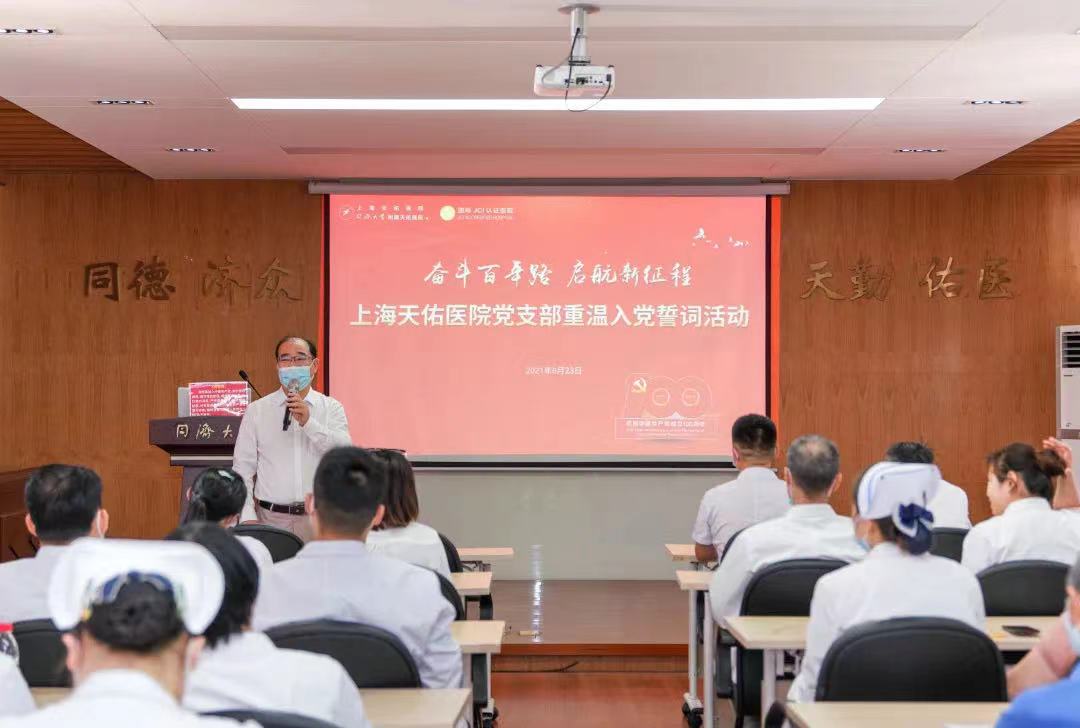 6月23日下午,上海天佑醫院黨支部在行政樓會議室舉辦重溫入黨誓詞活動。來自醫院各個崗位上的50余名黨員集合在莊嚴的黨旗下,佩戴黨徽,再一次舉起右拳,重溫入黨誓詞。多名入黨積極分子現場感受這一莊嚴氛圍。黨支部書記肖建同志主持。