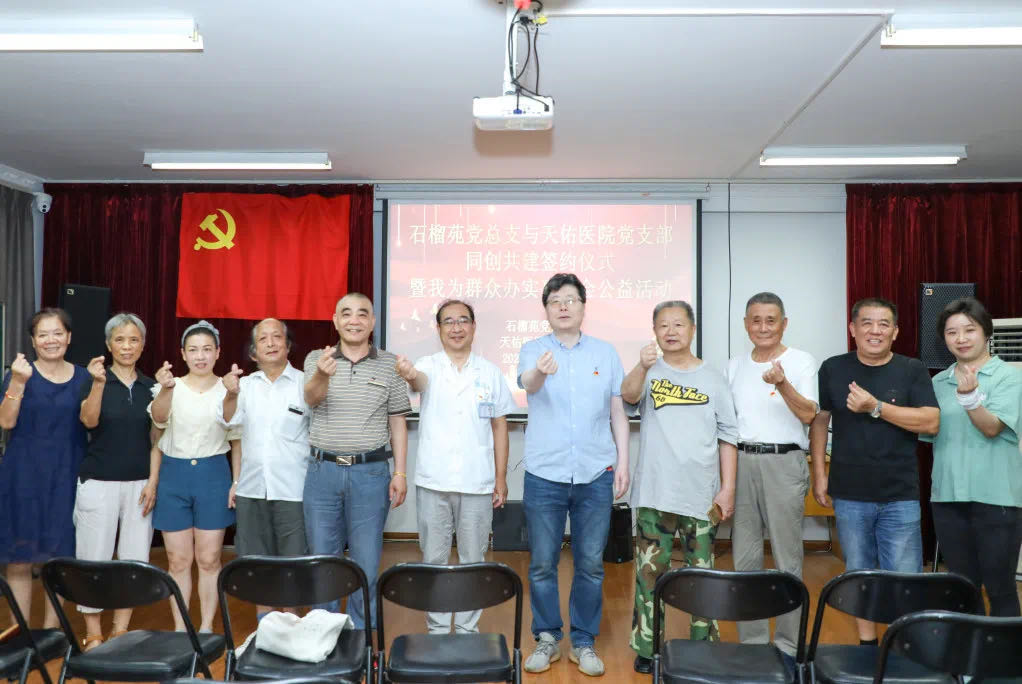 7月20日上午,上海天佑醫院志愿者們在黨支部書記肖建的帶領下來到桃浦鎮石榴苑社區開展公益服務。肖建書記代表醫院黨支部和石榴苑黨總支書記裴海寧簽訂“結對共建協議書”,醫院志愿者和部分居民代表現場見證。