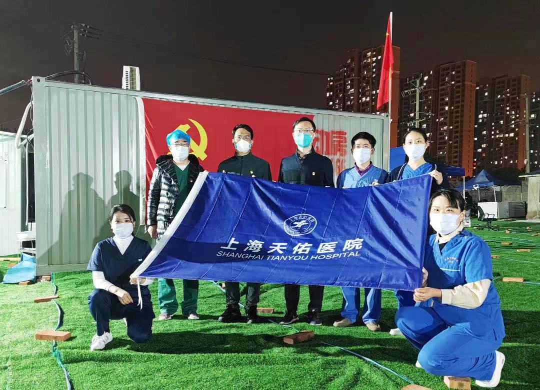 4月21日晚八點半,普陀區連亮路方艙醫院外場地上,黨旗在春天的夜空下飄揚,天佑醫院方艙醫療隊員們手托院旗,站在黨旗前準備接受一次“特殊的洗禮”——方艙醫院臨時黨支部正在為天佑醫療隊三位隊員舉辦“集體遞交入黨申請書”儀式。