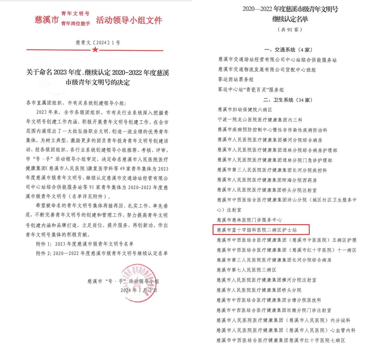 近日,慈溪市青年文明號、青年崗位能手活動領導小組印發了《關于命名2023年度、繼續認定2020-2022年度慈溪市級青年文明號的決定》,慈溪藍十字腦科醫院二病區護士站再次被認定為“慈溪市級青年文明號”,這是他們連續四年獲此殊榮。