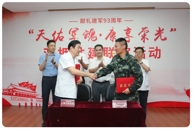 在第93個建軍節來臨之際,桃浦鎮雙擁共建聯誼活動于7月30日下午在同濟大學附屬天佑醫院(籌)舉行。本次聯誼活動由桃浦鎮人武部、桃浦鎮雙擁辦和上海天佑醫院聯合舉辦。桃浦鎮黨委委員、人武部部長陳火春,天佑醫院院長蔡劍飛、總經理卓立峰及院領導班子成員出席。桃浦鎮社發辦、武警上??傟爤糖诘谌ш牰箨?、普陀區消防桃浦特勤中隊、同濟大學老科協、老年大學、桃浦郵政局、地鐵運營公司等單位領導、現役或退役軍人代表50余人參加。