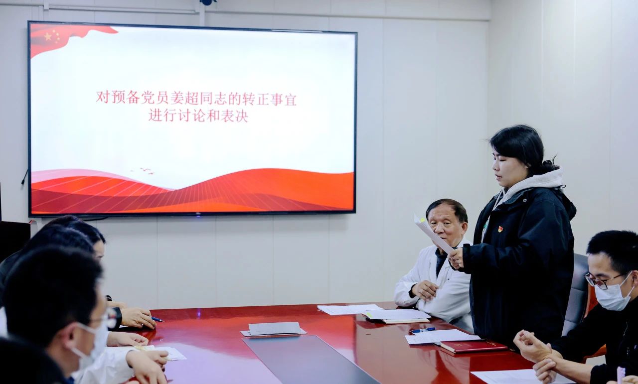 首先,姜超同志宣讀轉正申請,總結匯報了預備期內在政治思想、工作生活等方面的情況。之后,入黨介紹人胡玉堂同志、李蘭馨同志介紹了姜超同志的基本情況及其在預備期間的表現情況,趙宇蘭同志代表支部委員會介紹了對姜超同志在預備期間的教育和考察情況,同意按期轉正。