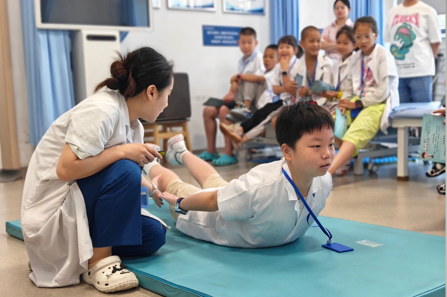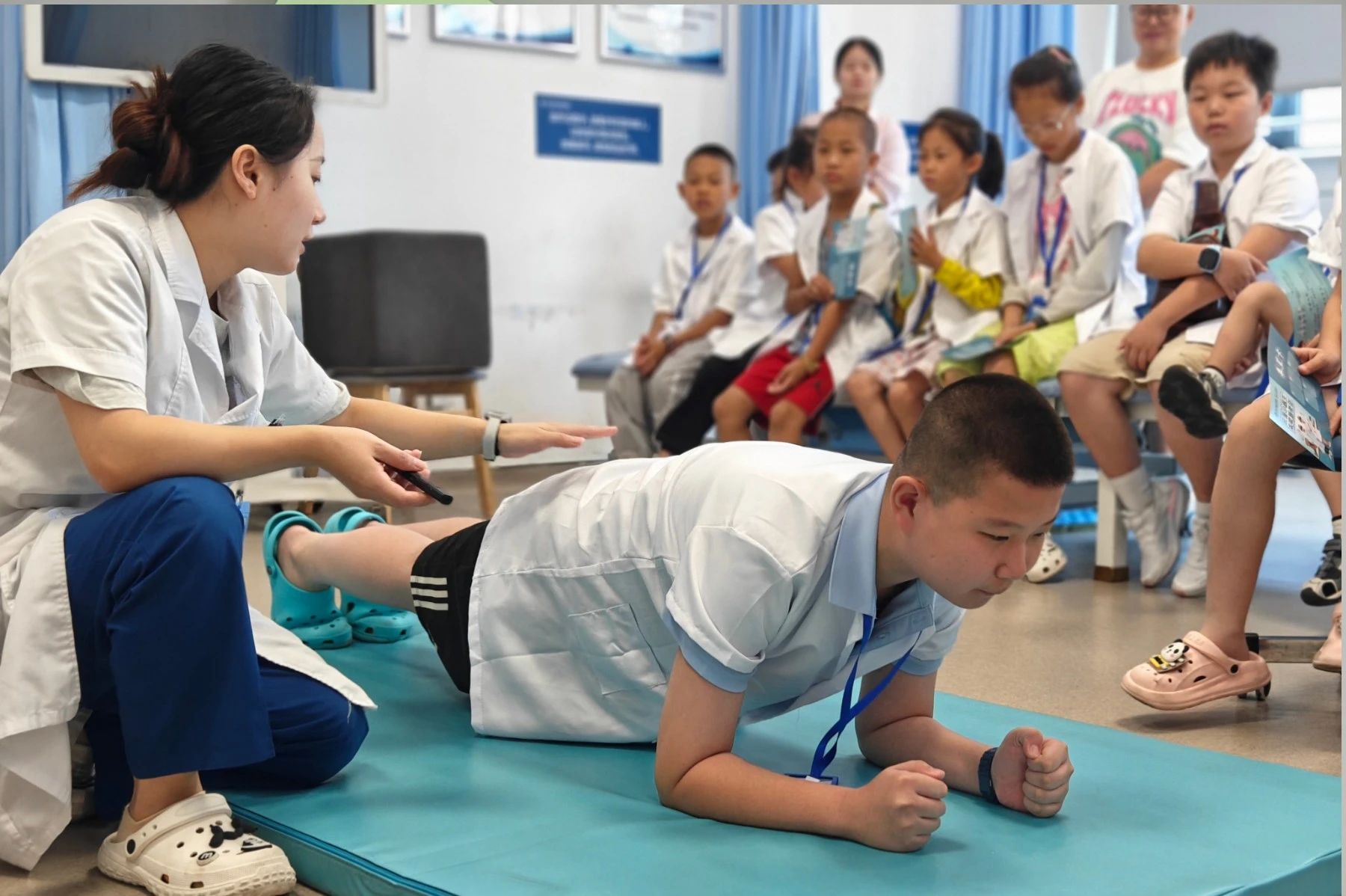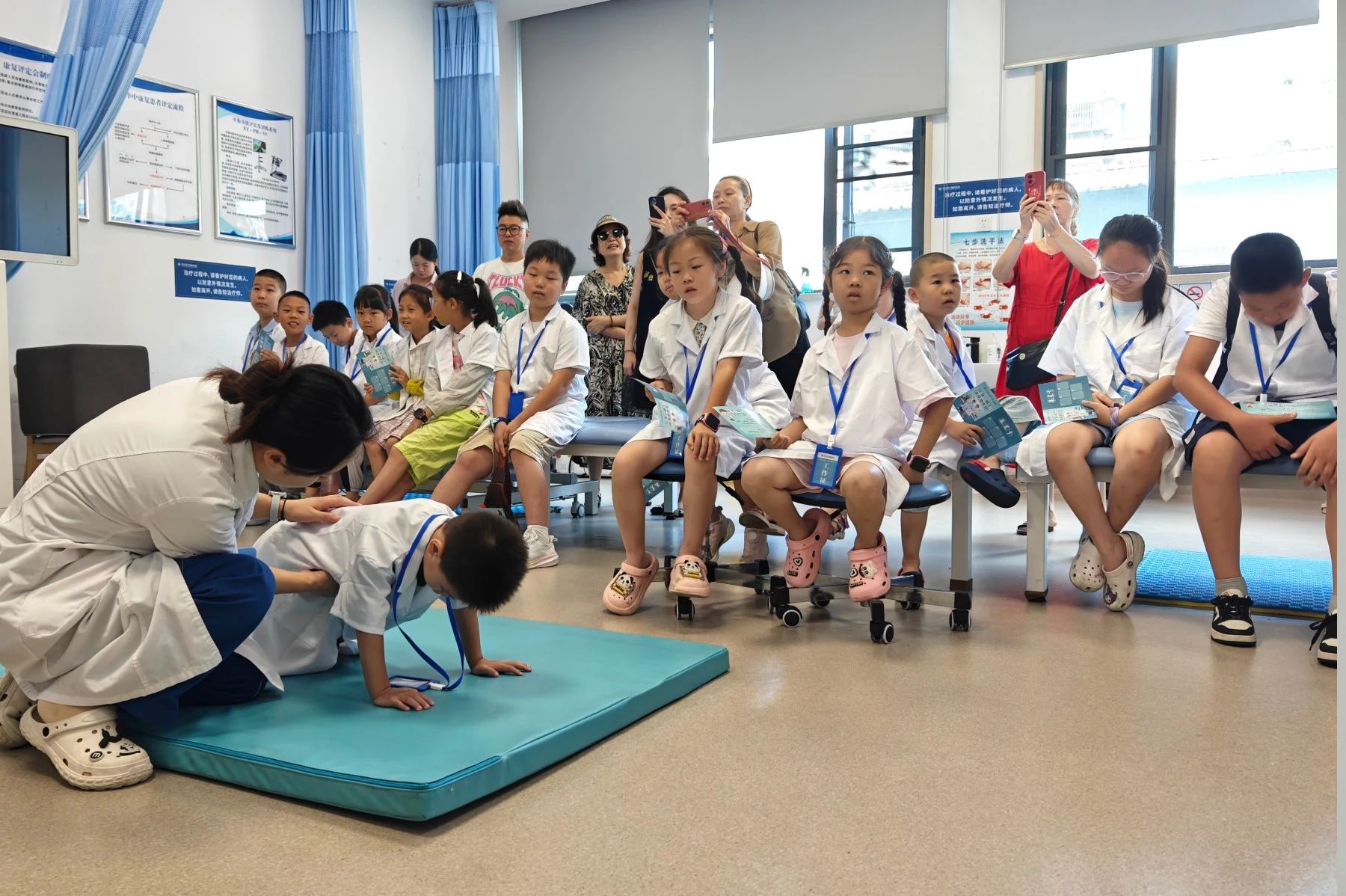 科室探索環節就像一場精彩的闖關游戲,讓孩子們在玩中學,深入了解醫學知識。在康復大廳,孩子們好奇地打量著這里的一切。王玉荷老師生動講解了康復病人的治療過程,并通過兒童肌骨骼健康互動問答,讓孩子們在輕松交流中加深對康復醫學的理解,對醫生的敬佩之情悄然萌發。