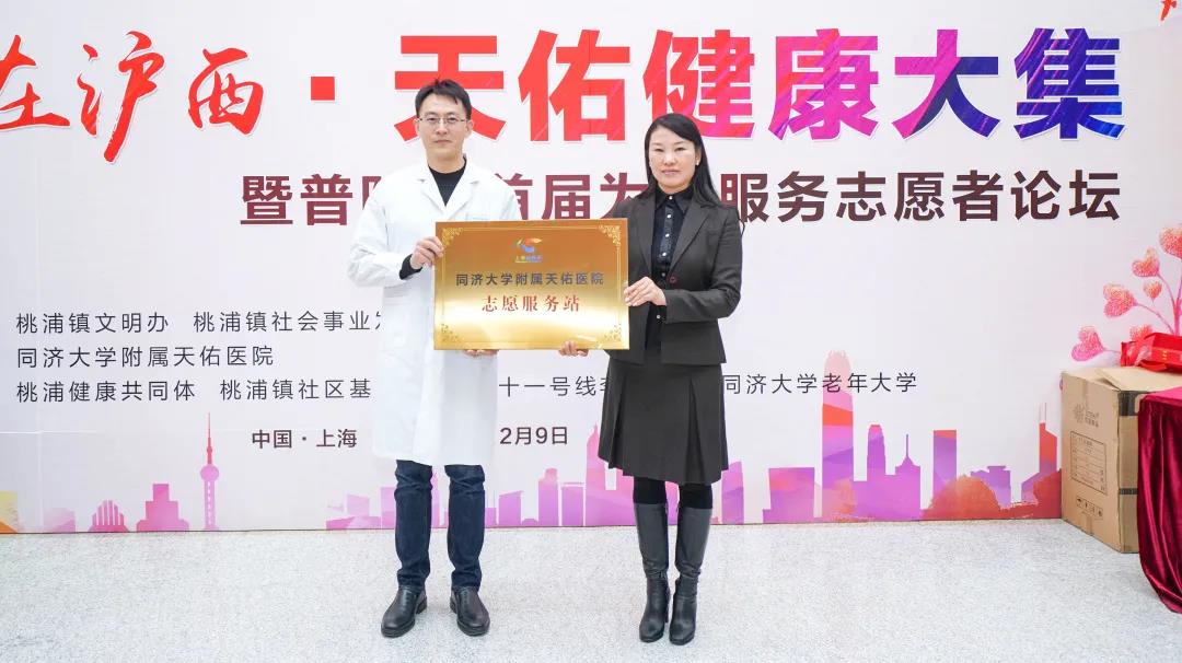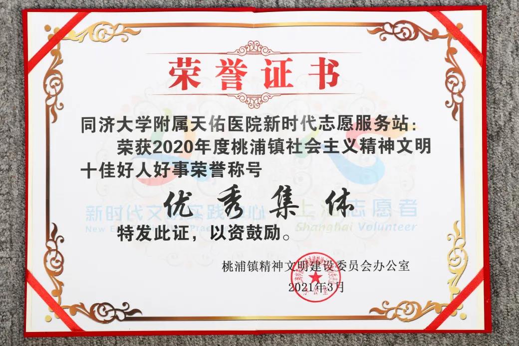 2019年12月2日,醫院被桃浦鎮文明辦正式授予“同濟大學附屬天佑醫院志愿服務站”,截止2020年底,天佑醫院志愿服務站共計吸納黨員志愿者22名,醫護志愿者50名。2020年開始,天佑醫院又承擔了健康桃浦1+1、健康桃浦“醫籃子”等公益項目,為區域內百姓提供醫療服務,樹立了良好口碑。