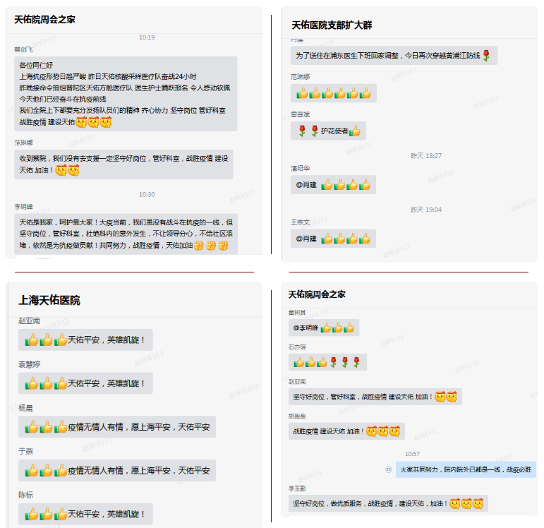 全院員工在了解到醫療隊快速奔赴一線后,紛紛通過微信留言,為戰友們加油鼓勁。很多員工表示隨時準備著,只要有需要,隨時出征,為普陀、為上??挂咦鞒鰬械呢暙I。